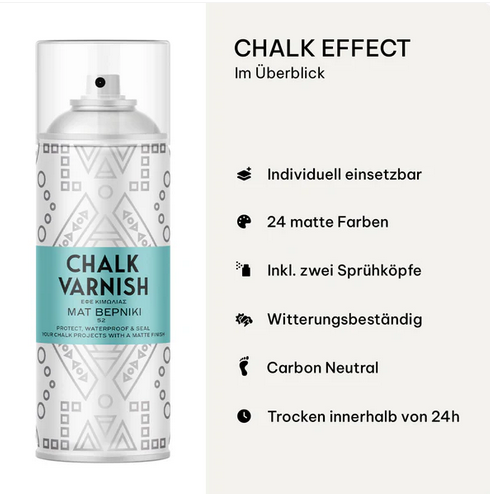 Verleihen Sie Ihren Oberflächen mit dem COSMOS LAC Chalk Effect - Mattes Varnish eine matte Kreideoptik. Dieses hochwertige Varnish in einer 400ml-Dose bietet nicht nur eine ansprechende Optik, sondern schützt auch vor UV-Strahlen und weist Wasser ab. Die spezielle Formel verleiht Ihren Projekten eine elegante, wasserabweisende Oberfläche mit einem Hauch von Kreide.
