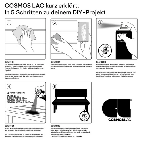 Dose 3 Minuten schütteln, vor erstem Auftragen kurz in die Luft sprühen, 1-2 Schichten im Abstand von 7-12 cm auftragen