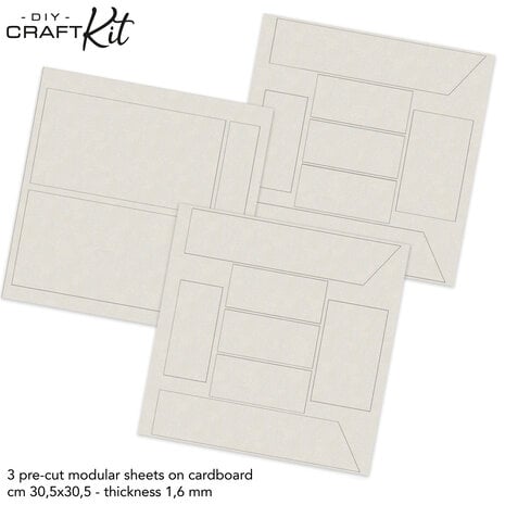 Wir sind stolz, Ihnen unser neues DIY-BASTELSETS vorstellen zu können, mit dem sowohl erfahrene als auch unerfahrene Scrapbooker ihre kreativsten Ideen in die Tat umsetzen können! Jedes Kit enthält alles, was Sie zum Erstellen eines vollständig anpassbaren Projekts benötigen: vorgeschnittene modulare Blätter auf Karton, Schneideelemente und Pergamentpapier zum Verschönern Ihres Projekts, eine Schritt-für-Schritt-Anleitung und ein exklusives Video-Tutorial! Alle im Kit enthaltenen dekorativen Elemente können frei kombiniert werden, um Ihrer Fantasie freien Lauf zu lassen! Mit den doppelseitigen Papieren können Sie mehrere Variationen desselben Projekts erstellen. Stellen Sie sich etwas vor, kreieren Sie es und teilen Sie es! Inhalt des Kits: 3 vorgeschnittene modulare Blätter auf Karton 30,5 x 30,5 cm – Dicke 1,6 mm; 10 doppelseitige Blätter 30,5 x 30,5 cm – 190 g/m² mit Texturen und Schneideelementen; Schritt-für-Schritt-Anleitung; Video-Tutorial zum QRCODE. Säure- und ligninfrei. Hergestellt in Italien von Ciao Bella Alzani Tipografia.