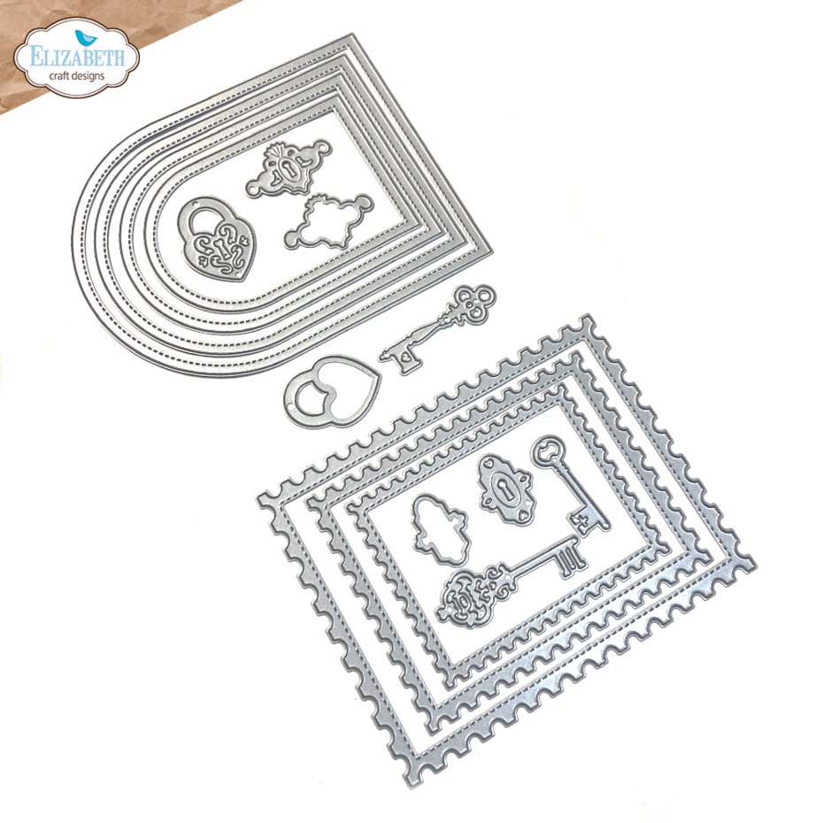 The 'Postage, Arches & Keys' Die Set is part of the Romantic Revival Collection from Everyday Elements. The arches and postage dies in the set allow you to create layered mats for focal images, fun card bases or concertina books, and the decorative keys and locks are perfect for adding a vintage finishing touch to your projects. This set includes 16 thin metal dies, with the largest measuring approximately 5.3" x 4.1" (13.5 x 10.4 cm).