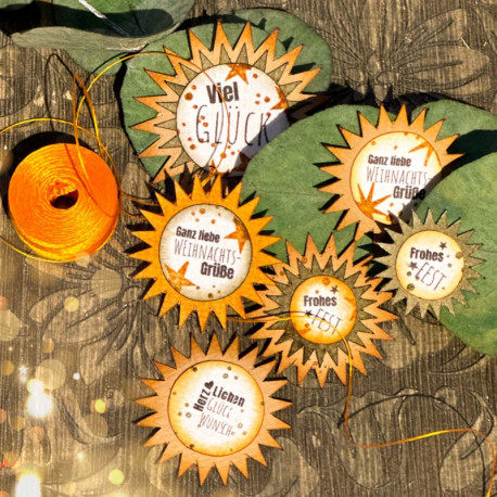 Das Stempelset 163 passt genau auf die Kreise und hat neben weihnachtlichen Texten auch allgemeine Glückwünsche für das ganze Jahr.