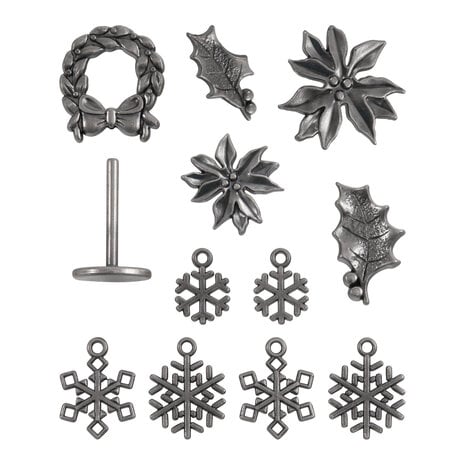 Tim Holtz Idea-ology Weihnachten 2025. Verleihen Sie Ihren Projekten festlichen Glanz mit den Tim Holtz Idea-ology Weihnachtsschmuckstücken. Diese detailreichen Metallanhänger mit Stechpalmen, Schneeflocken, Zuckerstangen und vielem mehr verleihen Ihren Bastelarbeiten einen metallischen Vintage-Touch. Enthält eine Auswahl an Weihnachtsanhängern aus Metall im Antik-Stil. Mit Weihnachtsmotiven wie Zuckerstangen, Kränzen, Schneeflocken und Stechpalmen. Ideal für Schmuck, Geschenkanhänger, Karten, Tagebücher und Schattenboxen. Robust und stilvoll im Vintage-Look. Einfache Befestigung mit Schnur, Draht, Biegeringen oder Kleber.