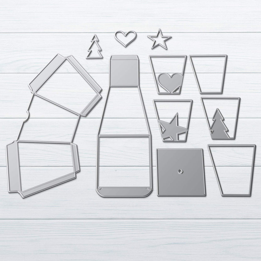 Vielseitiges Stanzschablonen-Set für eine kleine Trapez-Box mit vier verschiedenen Fenster-Optionen: Stern, Herz, Tanne oder neutral.