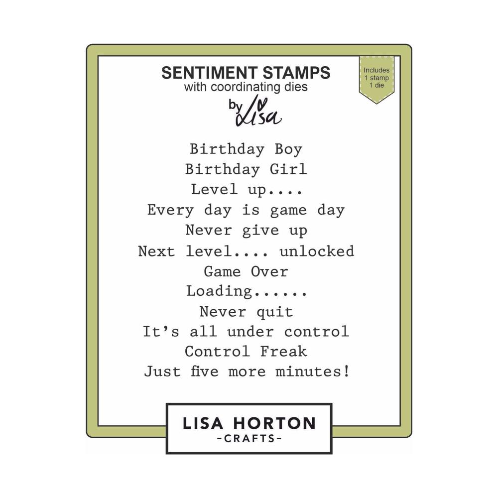 Dieses zweiteilige Set aus Stanzform und transparentem Photopolymer-Stempel „Loading“ wurde von Lisa Horton für Lisa Horton Crafts entworfen. Dieser Stempel enthält 12 Sprüche und die Stanzform schneidet die Sprüche aus. Der Stempel haftet auf einem Acrylblock und kann mit Ihren Lieblingstinten, Markern, Prägepulvern und anderen Bastelmaterialien (separat erhältlich) verwendet werden. Die dünne Metallstanzform ist mit führenden Stanzmaschinen (separat erhältlich) kompatibel. Diese Sprüche können für Karten, Scrapbook-Seiten, Etiketten, Tagebücher und andere Papierbastelprojekte verwendet werden. Einige der Sprüche in diesem Set sind „Birthday Boy“, „Birthday Girl“, „Niemals aufgeben“, „Kontrollfreak“ und „Nur noch fünf Minuten!“ und mehr.