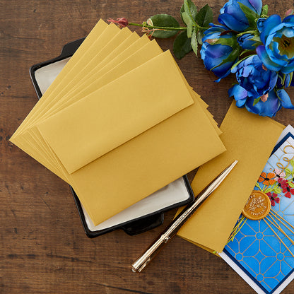 Die A2-Umschläge in gebürstetem Gold bestehen aus wunderschönem, perlmuttfarbenem Goldkarton. Die Packung enthält 10 quadratische Umschläge mit Klappe. Jeder Umschlag misst 11,10 x 14,60 cm und bietet somit Platz für eine Standardkarte im A2-Format. Jeder Umschlag hat eine Heftöffnung, eine gerade Klappe, einen Gummiverschluss und eine perlmuttfarbene Oberfläche.