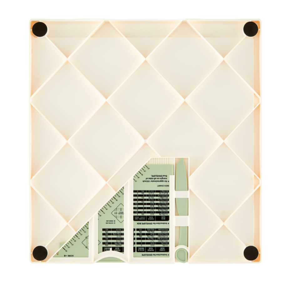 Lisa Horton Special Edition Falzbrett (30,5 x 30,5 cm) mit salbeigrünem Dreiecklineal und Falzwerkzeug. Mit diesem einfach zu bedienenden Werkzeug gelingen Ihnen präzise Papierfaltungen. Die Falzfläche misst 30,5 x 30,5 cm und ist alle 3 mm mit Falzlinien versehen. Neben dem Falzbrett enthält es ein spezielles salbeigrünes Falz- und Faltwerkzeug sowie ein Dreiecklineal zur Herstellung von Umschlägen und Schachteln. Falz- und Faltwerkzeug sowie Dreiecklineal lassen sich zur Aufbewahrung platzsparend auf der Rückseite des Bretts verstauen. Die Werkzeuge sind perfekt auf Ihre Lisa Horton Crafts Special Edition Platinum Six Stanz- und Prägemaschine abgestimmt. Dieses leichte Brett eignet sich für verschiedene Größen bis zu 30,5 x 30,5 cm. Ideal für Kartenbasteln, andere Papierarbeiten, Schulprojekte und vieles mehr!