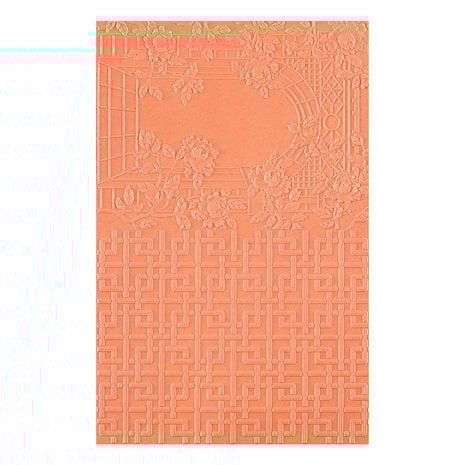 Die 3D-Prägevorlage „Regal Lattice“ bietet doppelte Gestaltungsmöglichkeiten in einer einzigen Vorlage! Die obere Hälfte der Vorlage zeigt einen eleganten Bambusbogen, der mit Ranken und Blättern bedeckt ist, während die untere Hälfte ein durchgehendes Gitterdesign aufweist. Jede Hälfte der Vorlage prägt eine Karte im Format A2, sodass Sie ganz einfach zwei Karten gleichzeitig erstellen können.