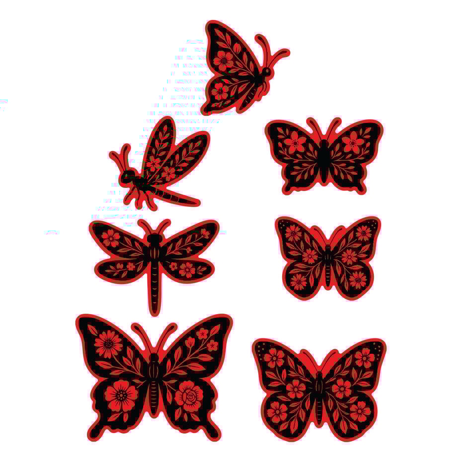 Ungefähre Größe: S5-754 Geätzte Stanzformen „Blühende Schmetterlinge“: Libelle: 5,20 x 3,90 cm Monarchfalter: 4,20 x 3,40 cm Breiter Schmetterling: 4,80 x 3,10 cm Libelle (Seitenansicht): 3,60 x 3,80 cm Schmetterling (Seitenansicht): 3,60 x 3,80 cm Großer Schmetterling: 6,30 x 5,10 cm Mittlerer Schmetterling: 5,40 x 4,10 cm