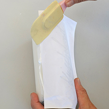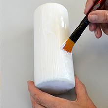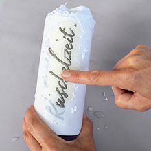 Das Wachs auf die gewählte Kerzenfläche sowie die Bildseite mit einem weichen Flachpinsel auftragen und zügig aufeinander platzieren (Bildseite zur Kerze). Mit einer Rakel o.ä. von der Mitte nach außen gleichmäßig und mit leichtem Druck über die Fläche ziehen. Überschüssigen Wachs entfernen. 24 Std. trocknen lassen. Anschließend Papierschicht gut durchfeuchten und die aufgeweichten Papierfasern vorsichtig wegreiben. Nach dem Trocknen das Motiv mit dem Wachs überstreichen.