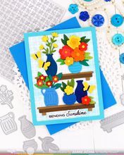 Stanz- und Prägeschablone // Set of 9 diesApproximate Assembled Sizes:Shelf: 3 1/2" w x 1/2" hRound Vase: 13/16" w x 11/16" hTall Vase: 3/4" w x 1 3/8" hPitcher: 1" w x 1 1/8" hFlower bundle: 1 1/8" w x 1 5/8" hSmall Flower: 9/16" w x 9/16" hLarge Flower: 7/8" w x 7/8" h