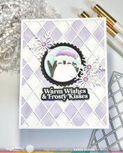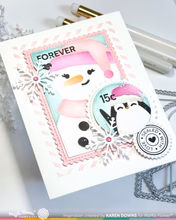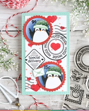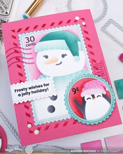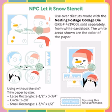 Dieses witzige Schablonenset mit Wintermotiven ist speziell für die Verwendung mit der Nesting Postage Collage Die (NPC) konzipiert. Es enthält Motive für alle drei Formen: einen gemütlichen Schneemann, einen fröhlichen Pinguin und eine verschneite Landschaft für das Etikettenband.
