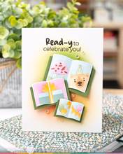 Mit diesem Schablonen-Set kreieren Sie im Handumdrehen eine festliche Geburtstagsatmosphäre auf Ihren Karten aus dem „Open Book Trio“-Stanzset. Ob Partyhüte, Luftballons oder ein Bär mit einem Cupcake – dieses Set verleiht Ihren selbstgemachten Karten einen festlichen Touch.